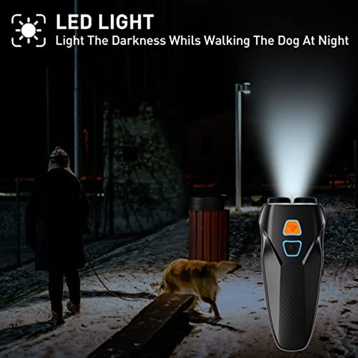 Safe and efficient dog training & behavior aids: dog barking control devices emits an ultrasound of 20~25 KHZ; which exceeds the range of human hearing but can easily lead to the dog's attention without hurting your dog like a dog whistle; safe to correct unwanted behavior and stop dog barking or prevent eating unsafe food; effective pet corrector for dogs of all types and sizes of age 6 months to 8 years old sonar heads up to 25ft range effect : this anti barking device with dual heads has higher power and more effective than the single head on the market; this electronic dog whistle equips with 800mah rechargeable battery; provide full charge in 1 to 2 hours for about 30 days of regular use Two modes with flashlight ultrasonic dog whistle to stop barking ; Deterrent mode:emit a higher intensity ultrasonic sound while the flashlight flashes to drive the fierce dog away; Training mode: emit a lower intensity ultrasonic sound to assist in daily dog training such as stop excessive barking; fighting; biting; and correct other unwanted behaviors; the flashlight also has a long-bright mode for walking your dog at night Slim design with anti-mistake lock key: this dog barking deterrent devices is slimmer that make it is better fit even in a smaller hand; the independent and clear keys make it easy to use; the anti-mistake lock key will avoid false triggers; also come with a adjustable wrist strap for use outdoor Button pressing with vibration effect : when pressing the button of this ultrasonic dog bark deterrent devices; it will also have a vibration effect; which will bring you a better experience ; and the button light indicator will be red in low power